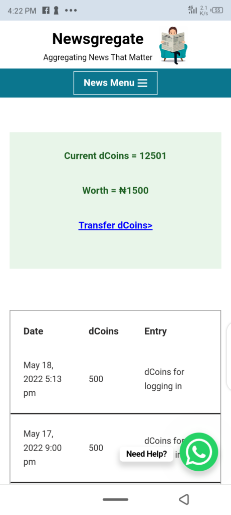 Newsgregate is a news aggregating website that encourages news reading by rewarding members with virtual coins called dCoins (which can be converted to real money). The website also rewards members with N1,500 when they invite others to read.